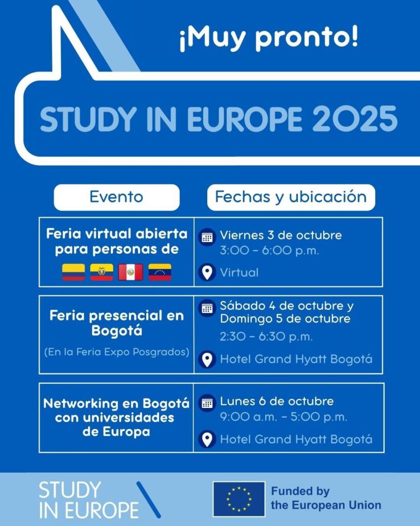 Viernes 3 de octubre, 3:00 – 6:00 p.m.FERIA VIRTUAL abierta a todos los interesados de Colombia, Ecuador, Perú y VenezuelaConéctate para conocer cómo puedes lograr tus planes académicos y de investigación en Europa.Información y registro aquí:https://www.daad.co/es/event/feria-virtual-study-in-europe-participan-mas-de-30-instituciones-de-europa/
