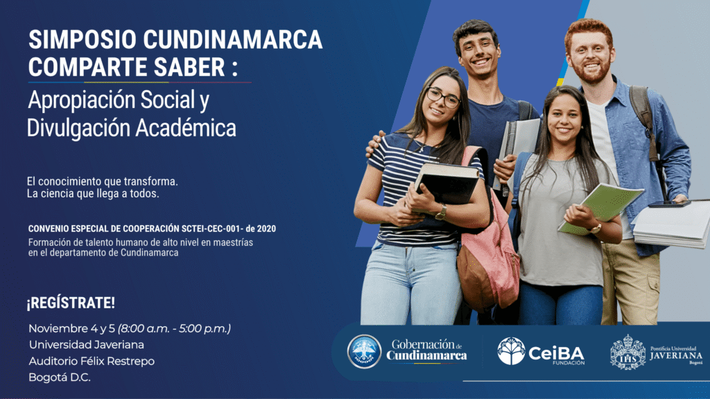 La Gobernación de Cundinamarca, la Fundación CEIBA y la Pontificia Universidad Javeriana tienen el gusto de invitarle al Simposio Cundinamarca Comparte Saber: Apropiación Social y Divulgación Académica, que se realizará los días 4 y 5 de noviembre de 2025 en Bogotá D.C.